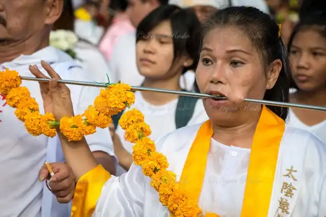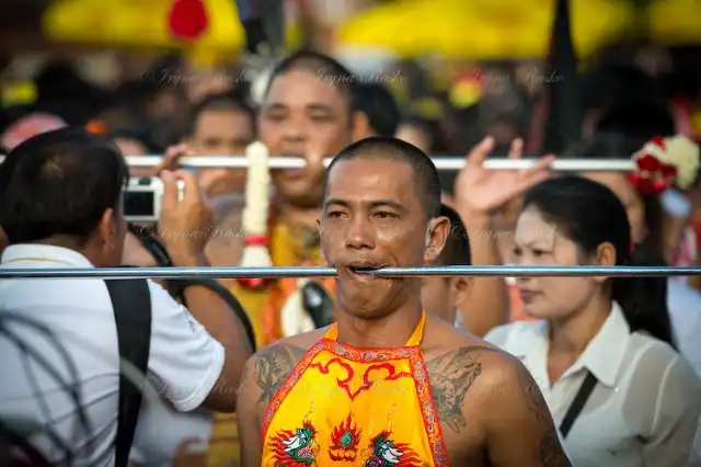 Это интересный и яркий религиозный праздник со множеством ритуалов и уличных шествий. Проходит он в течении девяти дней в первой декаде 9-го месяца Китайского лунного календаря (это сентябрь - октябрь месяц)... Всё верно, праздник Китайский и проходит на Пхукете (провинция и остров в Таиланде), так как более 35% населения по происхождению китайцы. Праздник посвящён Девяти Богам Имеператорам (Nine Emperor Gods) в соответствии с Даосисткой религией.