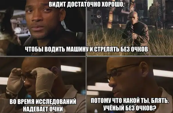 Про очки в фильме "Я легенда" поясню. У него в очках была видео камера.