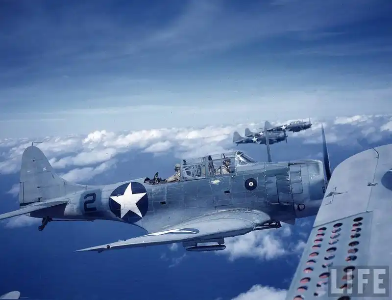 Это фотографии эскадрильи SBD «Даунтлесс» в полете. SBD Dauntless — американский палубный пикирующий бомбардировщик — разведчик. Считается наиболее удачным палубным пикирующим бомбардировщиком американских ВМС в годы второй мировой войны.