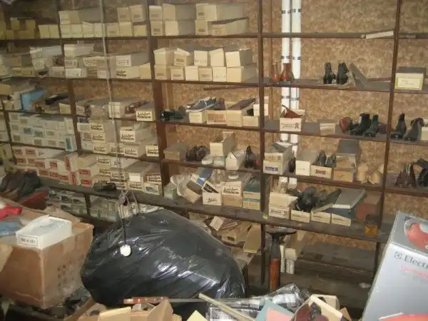 А внутри магазина огромные стеллажи забитые новенькой и ни разу не использованной обувью, которой уже почти полвека. Обувь из натуральной кожи, качественая, за такой долгий срок не потеряла своих потребительских качеств, только немного запылилась. И вполне может быть продана за очень серьезные деньги, ведь это настоящий винтаж, который сейчас в моде. Хипстеры с руками оторвут!