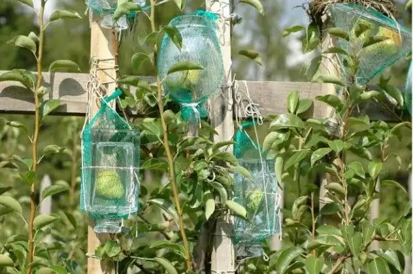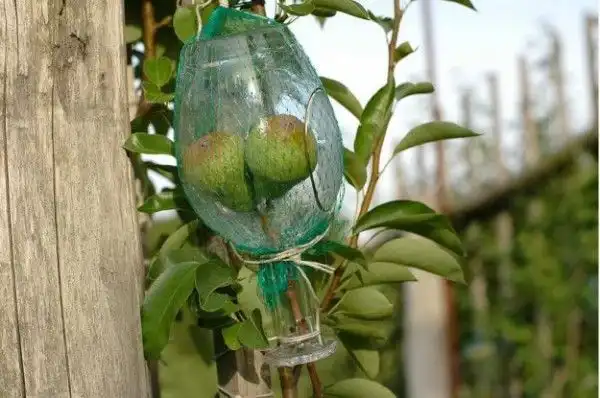 На плодовое дерево груши, надеваются пустые бутылки, на каждую завязь плода по бутылке, и привязываются эти бутылки, разумеется, к веткам.