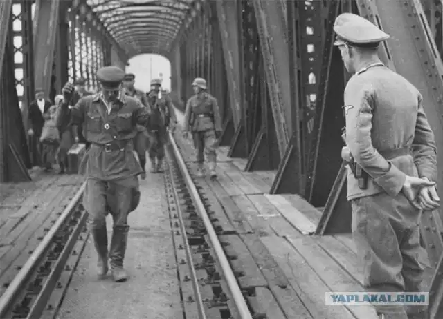 Первая неделя войны. Солдаты из немецкой 101-й пехотной дивизии конвоируют пленных командиров Красной Армии по мосту через реку Сан в пограничном городе Перемышль (ныне Пшемысль, Польша). Справа на переднем плане — офицер СС. Город был взят немцами днем 22 июня, но уже на следующее утро был освобожден советскими войсками. 99-я стрелковая дивизия генерала Н.И. Дементьева, действуя совместно с пограничниками и батальонами Перемышльского укрепленного района, трижды выбивала из города части немецкой 101-й пехотной дивизии. Город удерживался до 27 июня, когда был окончательно оккупирован.