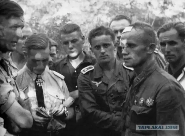 Герой Советского Союза майор Яков Иванович Антонов из 25-го ИАП в немецком плену, в окружении германских летчиков, которые с интересом слушают своего коллегу. Видно, что разговор идет профессиональный.