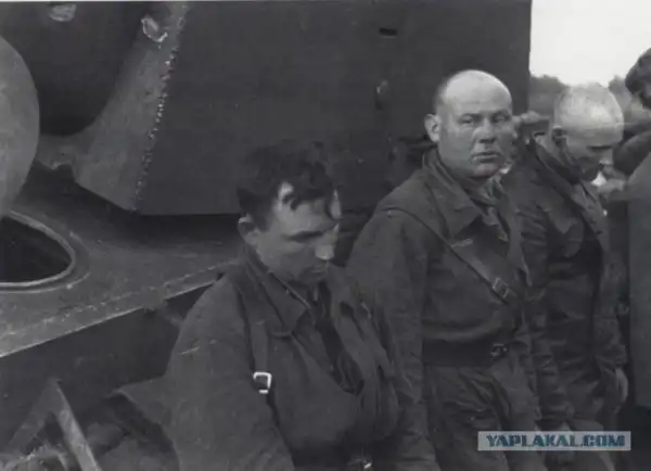 Пленные советские танкисты из состава 2-й танковой дивизии 3-го мехкорпуса Северо-Западного фронта у своего танка КВ-1. В конце июня 1941 года в районе города Расейняй вместе с другим КВ-1 этой же части вел бой за развилку дорог. После потери возможности вести огонь был окружен немецкими солдатами, уцелевшие члены экипажа были взяты в плен после того, как немцам удалось сорвать ломом крышку люка механика-водителя.
