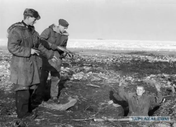 Два немецких солдата берут в плен красноармейца.