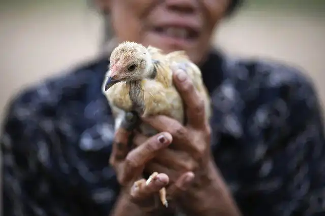 7. Местный житель держит цыпленка на берегу реки Меконг.