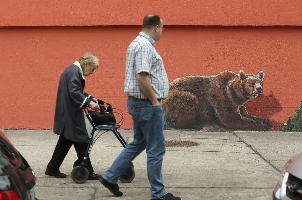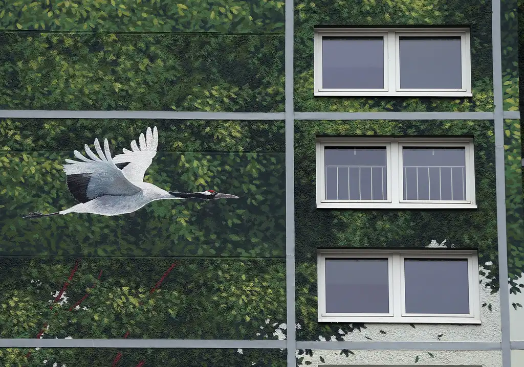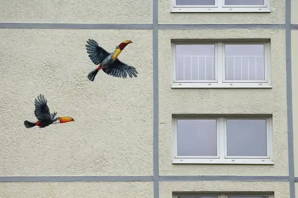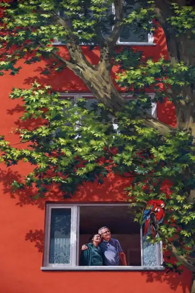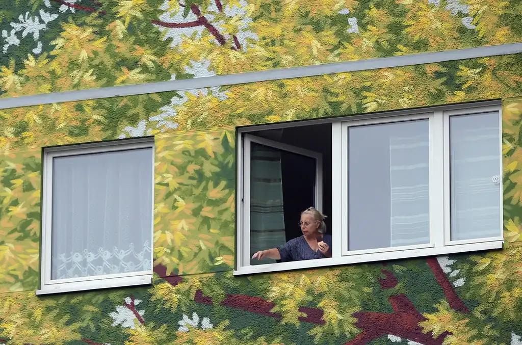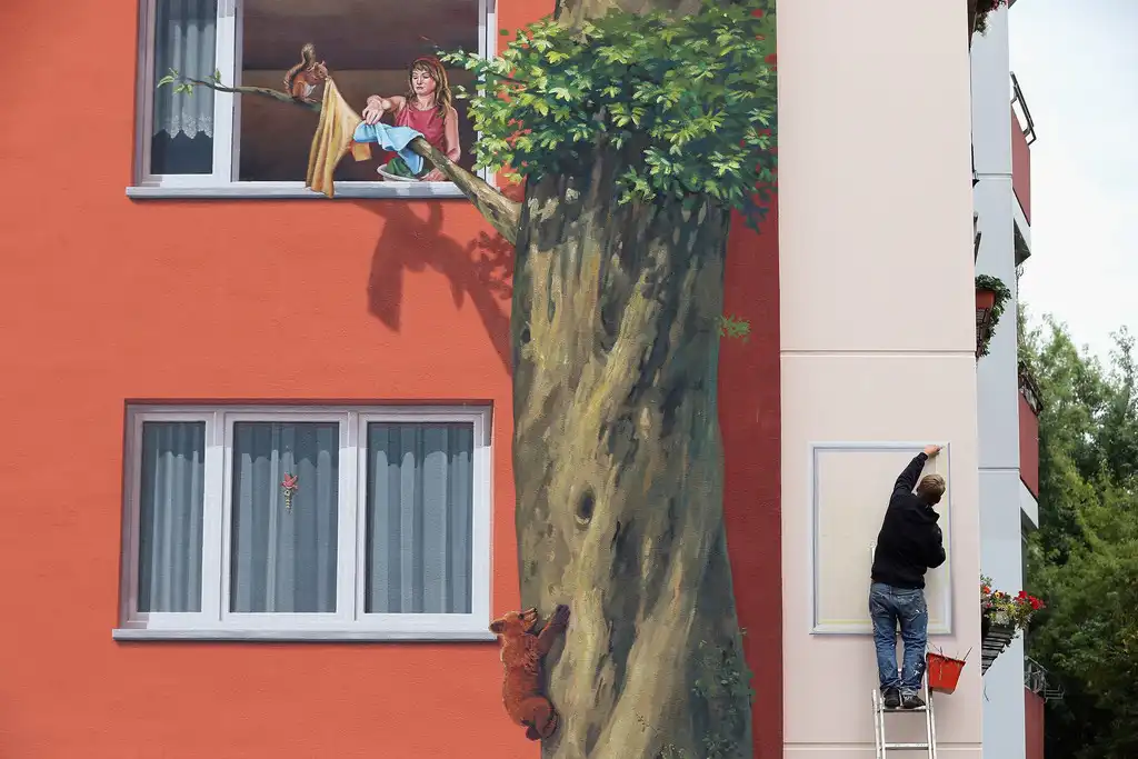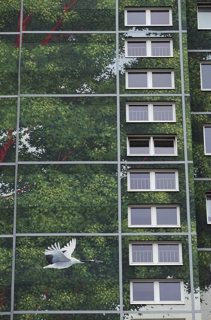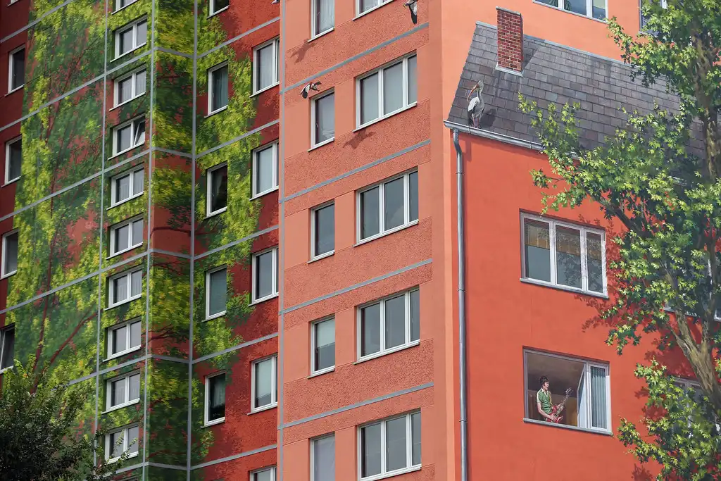 Здание называется «Wohngenossenschaft Soldaritaet coop» и практически все оказалось под росписью. Точнее, только его фасадная часть. В общей сложности было покрыто изображениями 22 тысячи квадратных метров, что можно действительно считать мировым рекордом. Организаторы уже подали заявку в Книгу рекордов Гиннесса. Нарисованные деревья изображают различных животных, а в окнах маячат разные нарисованные люди - нескучно :)