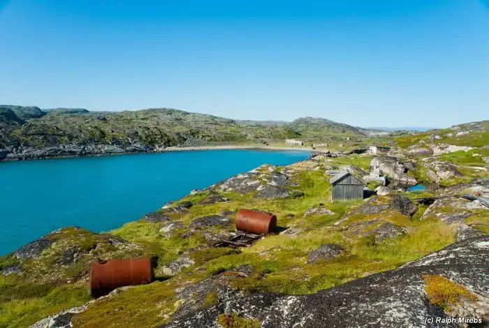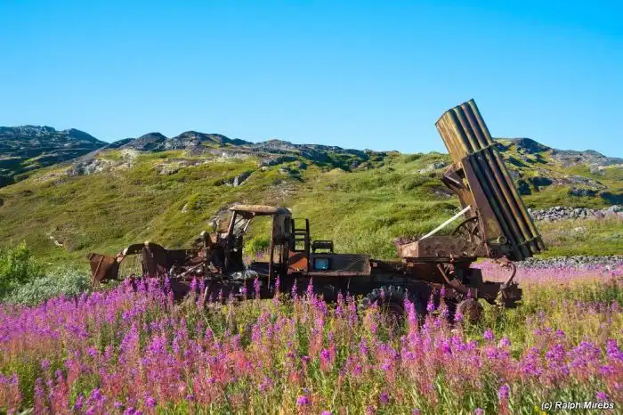 Советую вам обязательно посмотреть на невероятный контраст глубокого синего моря, ярких и разноцветных цветочных полян и заброшенной тяжелой военной техники, которая оставлена на растерзание природных сил на берегу Баренцева моря в бухте Малая Калиновая. В 1995 году дивизион был расформирован, а боевые машины: ДП-62 "Дамба" - береговой самоходный реактивный бомбомётный комплекс, так и остались в гордом одиночестве на страже нашей безопасности.