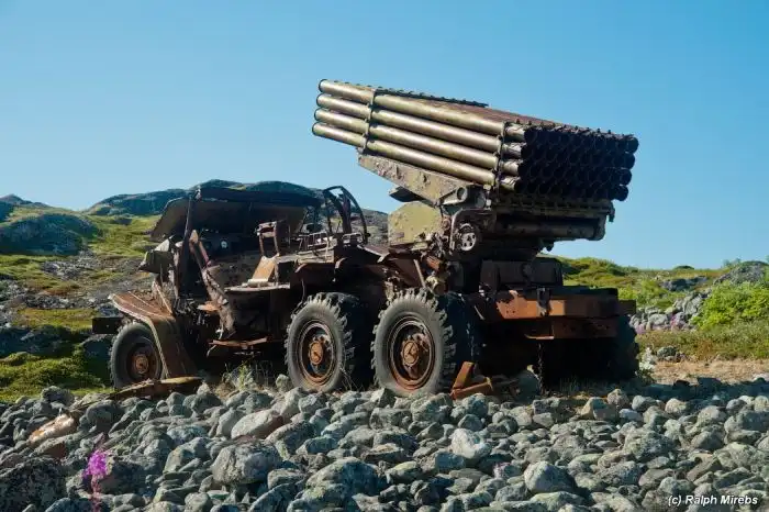 Заброшенная тяжелая военная техника на берегу Баренцева моря