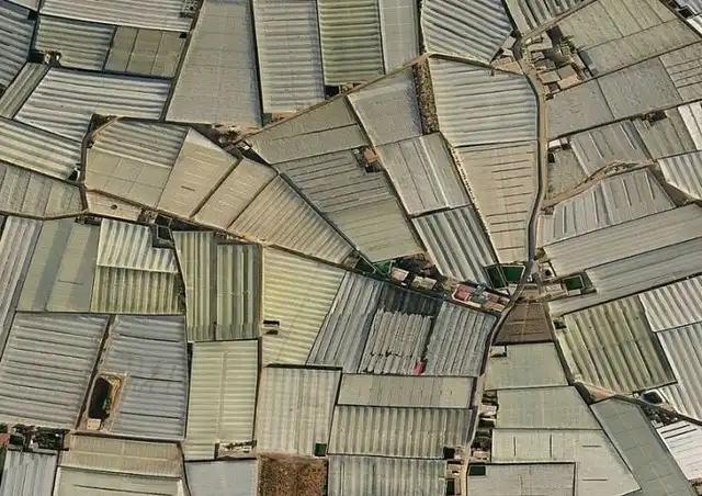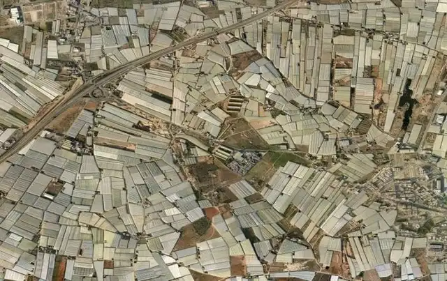 Это снимок, сделанный с борта самолета, на котором вы видите место под названием «грандиозные теплицы Альмерии». Еще с 80х годов прошлого века эта небольшая прибрежная равнина в 30 км на юго-запад от испанского города Альмерия превратилась в крупнейшее сосредоточие теплиц в мире, занявших почти 26 000 га.