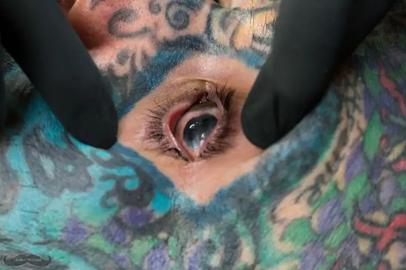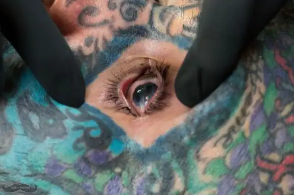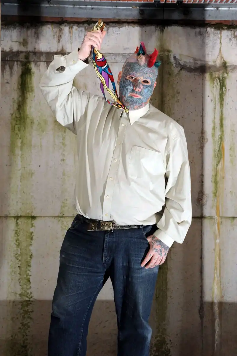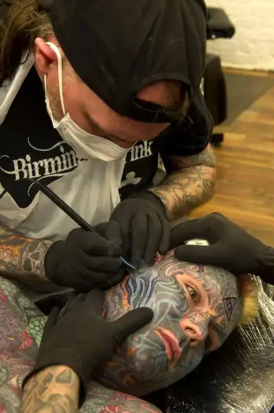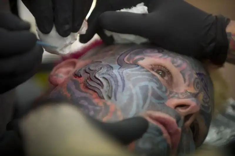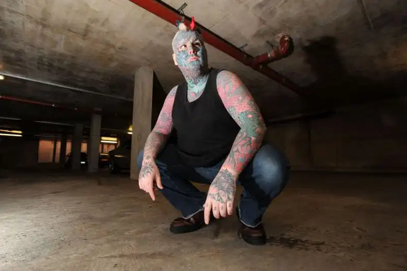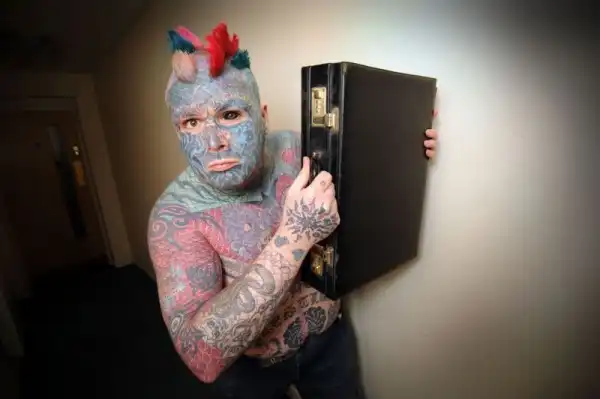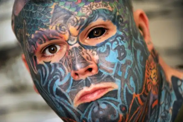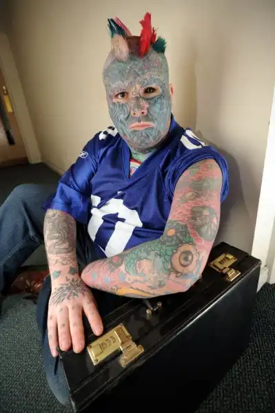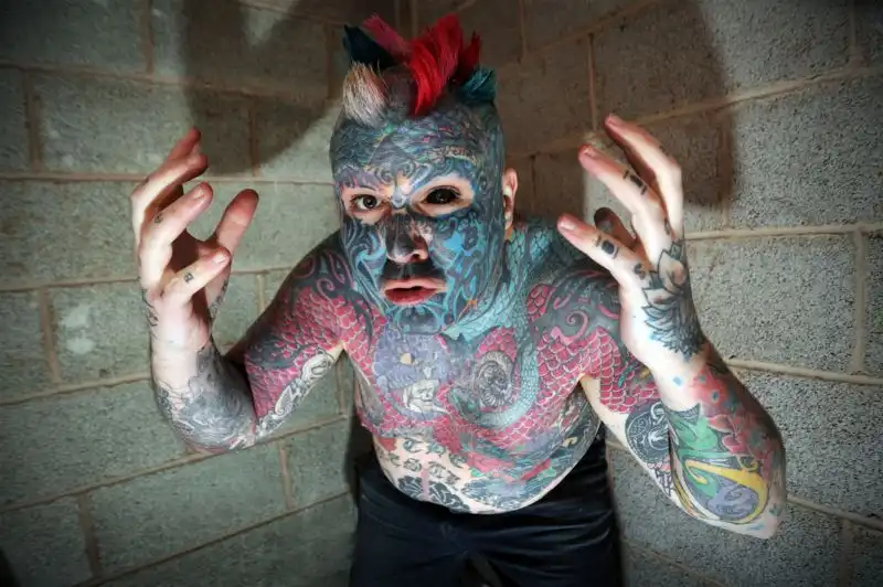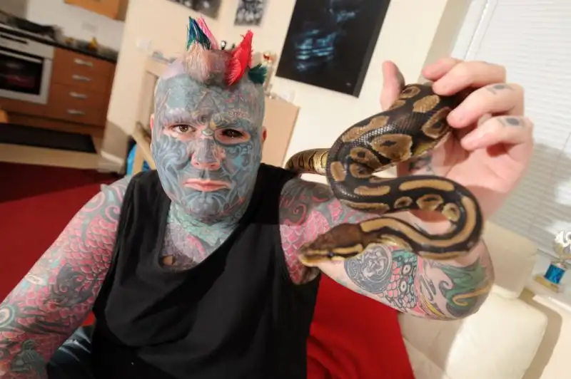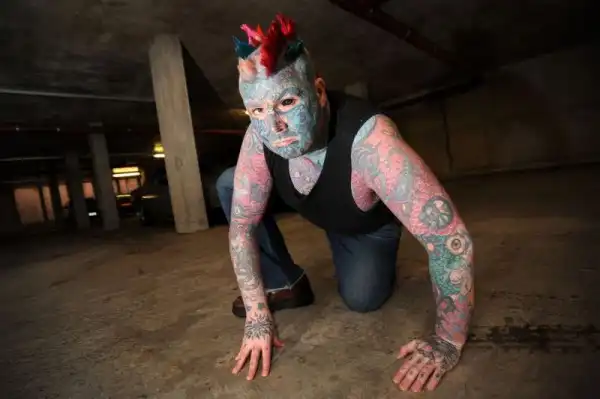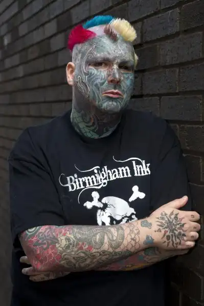 33-летний Мэтью Уилан по праву считается самым татуированным человеком Великобритании. 80 процентов поверхности его тела покрыта наколками. Первую татуировку он сделал в 16 лет, но мечтал о ней с 9. На данный момент наносить краску практически некуда, поэтому Уилан начинает придавать узорам на лице объемный вид при помощи шрамирования.