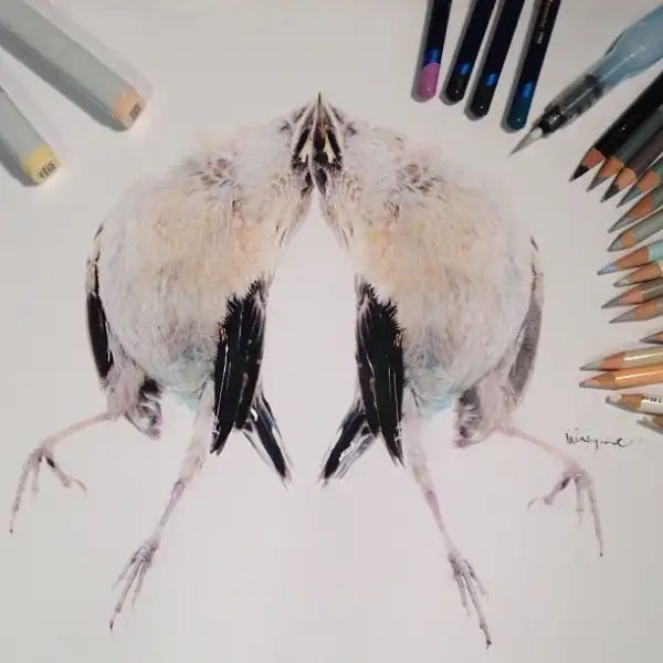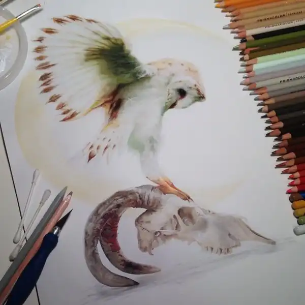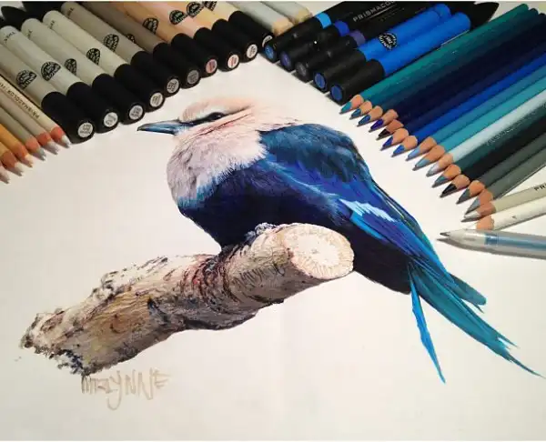 Фотографии своих работ рядом с «инструментами», которые использовались для их создания, она выкладывает в Instagram. Смотря на детально прорисованное оперение разноцветных птиц или на всплеск волны на закате солнца, трудно поверить в то, что эта красота нарисована самыми обычными материалами.