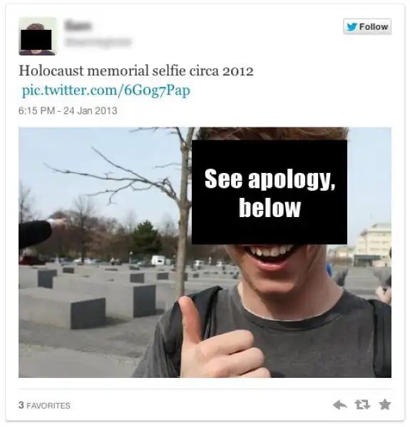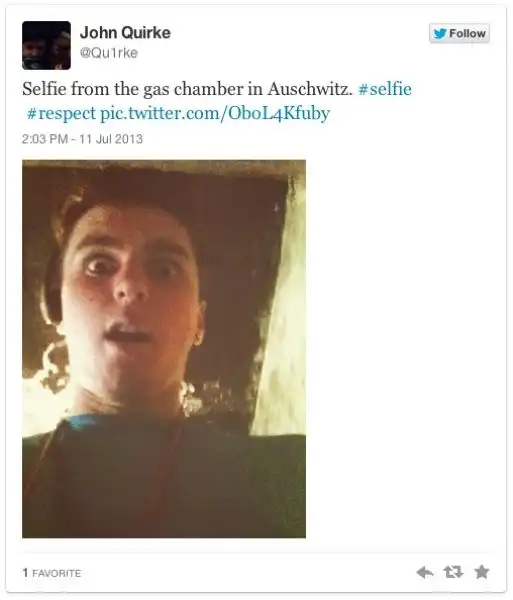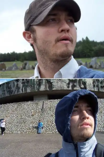 На просторах западного интернета завели интересный блог, где выкладывают фотографии граждан, сделанные в местах совсем не забавных - концентрационных лагерях, мемориалах, похоронах. Некоторые авторы этих самострелов пишут сообщения админу сайта, в которых каются и просят удалить инфу, другие же наоборот целенаправленно шлют свои автопортреты.