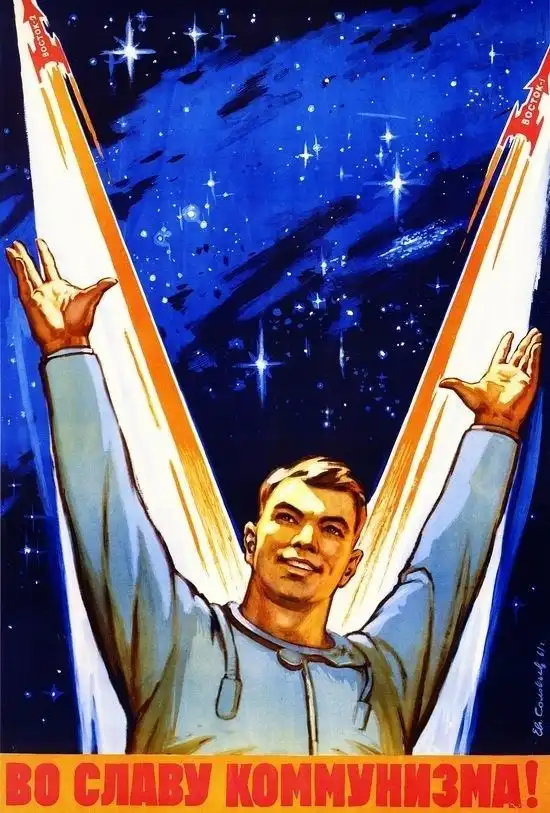 В далекие 1958-1963 годы для русского человека появился еще один инструмент для мотивации - космос. На тот момент СССР уверенно выигрывал космическую гонку у Америки, следствием чего стала эта коллекция мотивационных постеров.