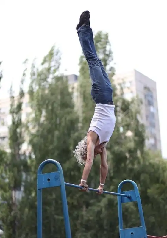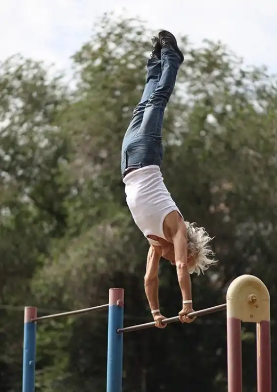 Его зовут Вячеслав. Для всех он уже давно стал Дядей Славой или Дедом, который крутит "солнышко". Жилистый седовласый он до сих пор в форме и делает по 6-9 оборотов "солнышка" на турнике как раз-два. Сейчас со сменой погоды многие перешли в помещения и он тоже. Но он перешёл на каток и танцует под музыку на льду у нас во дворце спорта. Ну так вот. Представляю вашему вниманию несколько фотографий, которые у меня остались с этого лета.