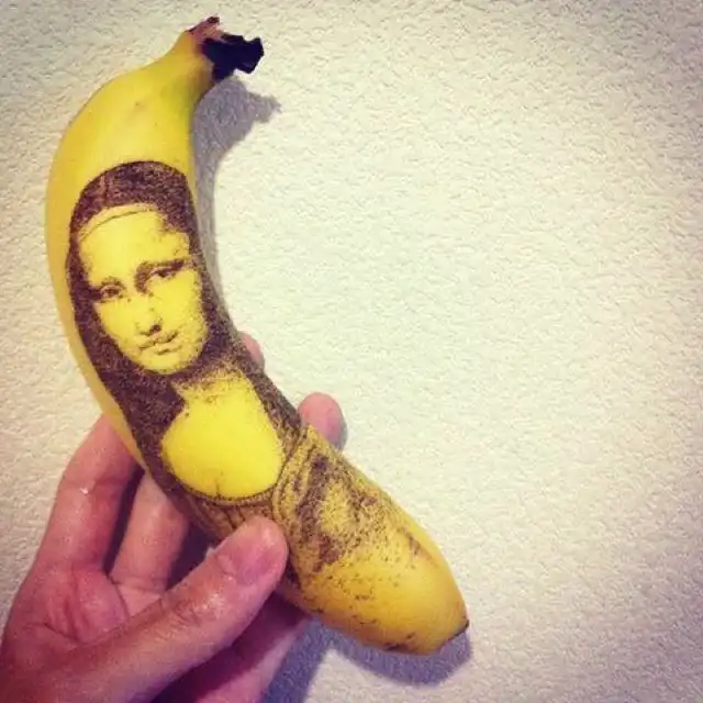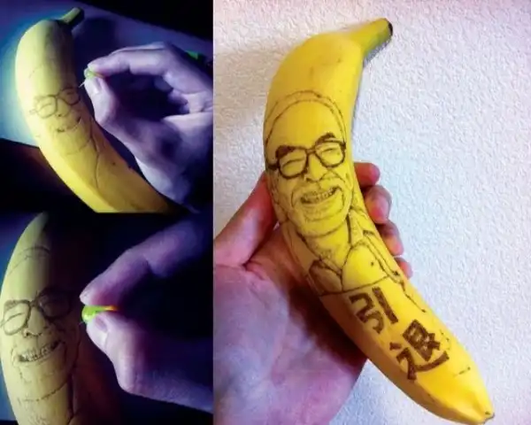 Японский художник Энд Кейп, работающий в Токио, специализируется на нанесении татуировок бананам. Процесс может затянуться по пяти часов, а то и более - в зависимости от сложности рисунка. После завершения работы нужно обязательно сфотографировать банан, потому как картина полностью исчезает через день-два.