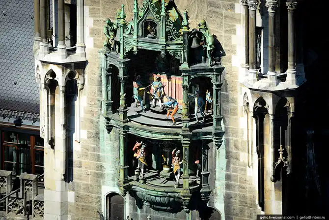Центральная площадь города — Мариенплац (Marienplatz), в районе которой расположены многие достопримечательности, в том числе старая и новая ратуша.
