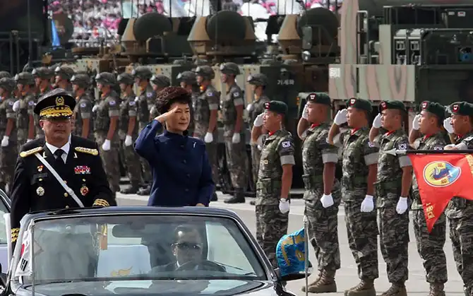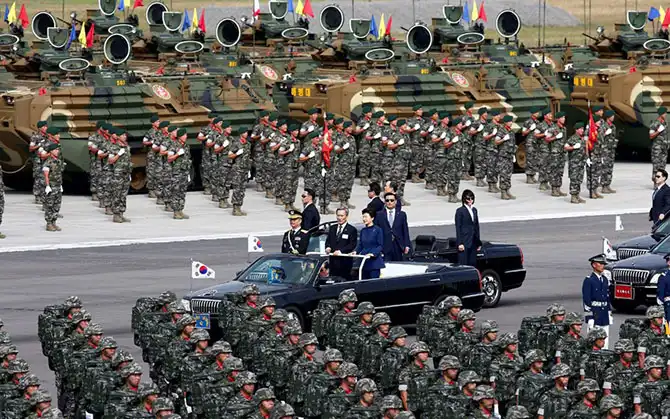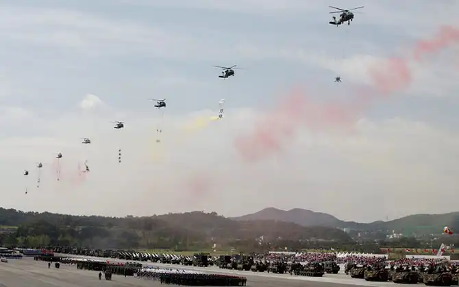 Около 11 000 войск, 190 оружейных систем и другого оборудования и 120 самолетов были представлены во время церемонии, посвященной Вооруженным силам Южной Кореи в военном аэропорту на юге Сеула. Корейский полуостров до сих пор официально в состоянии войны, поскольку Корейская война 1950-53 закончилась перемирием, а не подписанием капитуляции. Около 28 500 американских военнослужащих находятся в Южной Корее.