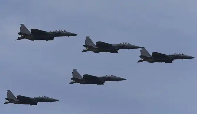 Строй самолетов F-15K южнокорейских ВВС в небе.