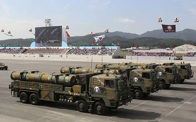Это своего рода демонстрация силы. Северная Корея демонстрирует свои ракеты на национальных юбилеях. Сегодняшняя церемония не, сказал Ли Дэу, аналитик по вопросам безопасности частного института Sejong, Сеул. Сегодня День Вооруженных сил, и (Южная Корея) ясно показывает, что у нее есть возможность наказать Северную Корею.