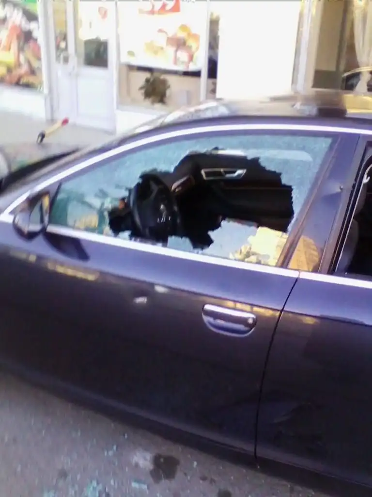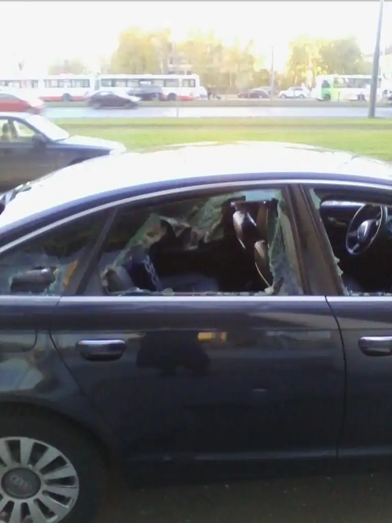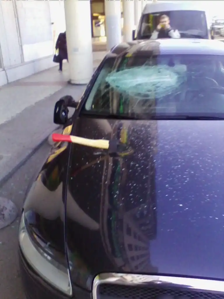 Следущие фотографии сделаны в петербургском районе Купчино. В автомобиле Audi, припаркованном на тротуаре рядом с «Евразией» на проспекте Славы, все окна были выбиты с помощью новенького топора, который был оставлен на месте преступления торчащим из капота. Второй топор — лежал под автомобилем.