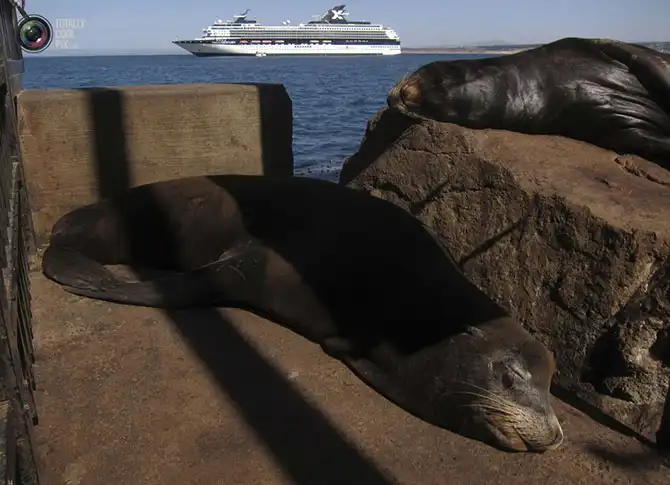 Морские львы греются на солнце на набережной в Монтерее, штат Калифорния, США.