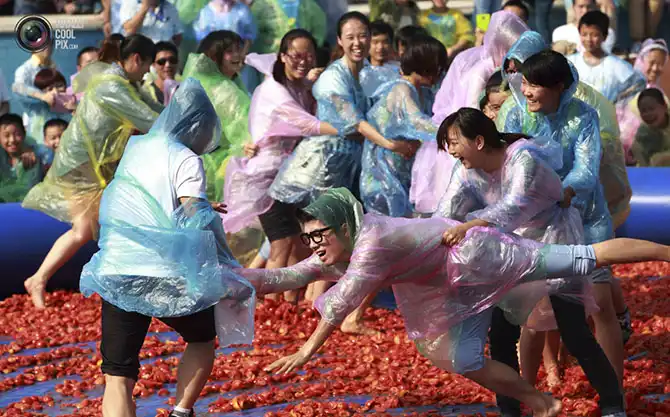 Мужчина поскальзывается во время битвы помидорами в парке в городе Чанша в провинции Хунань, Китай.