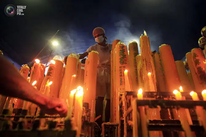 Верующий зажигает свечи в китайском храме во время ежегодного Вегетарианского фестиваля в Бангкоке, Таиланд.