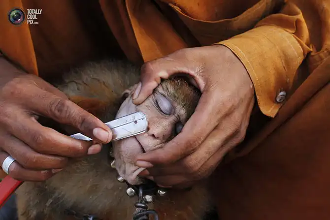 Мужчина бреет свою обезьяну перед выступлением в Лахоре, Пакистан.
