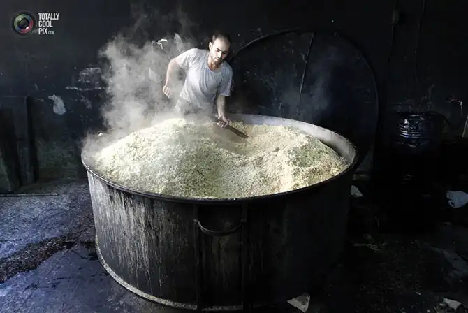 Рабочий готовит еду для беженцев в городе Ракка, Сирия.