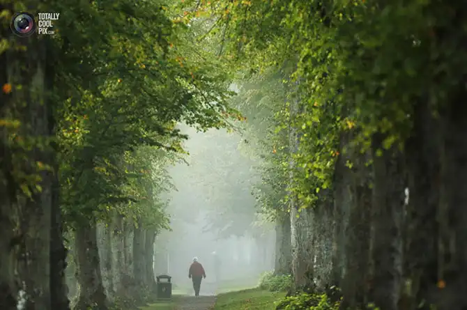 Женщина гуляет в осеннем тумане возле замка Арундел на юге Англии.