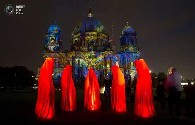 Зрители смотрят световую инсталляцию в день открытия Фестиваля света в Берлине, Германия.