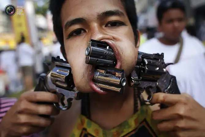 Верующий принимает участие в уличном шествии на Вегетарианском фестивале в Пхукете, Таиланд.