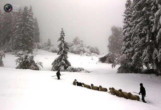 Баварские фермеры гонят отару овец между Гармиш-Партенкирхеном и Миттенвальдом.