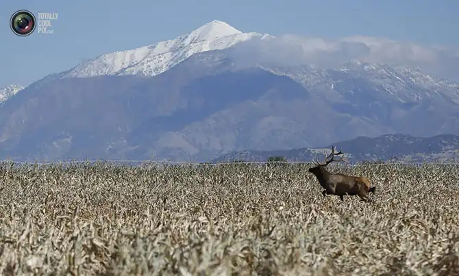 Олень бежит по кукурузному полю во время сбора урожая на ферме Kenison Farms в Леване, штат Юта, США.