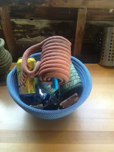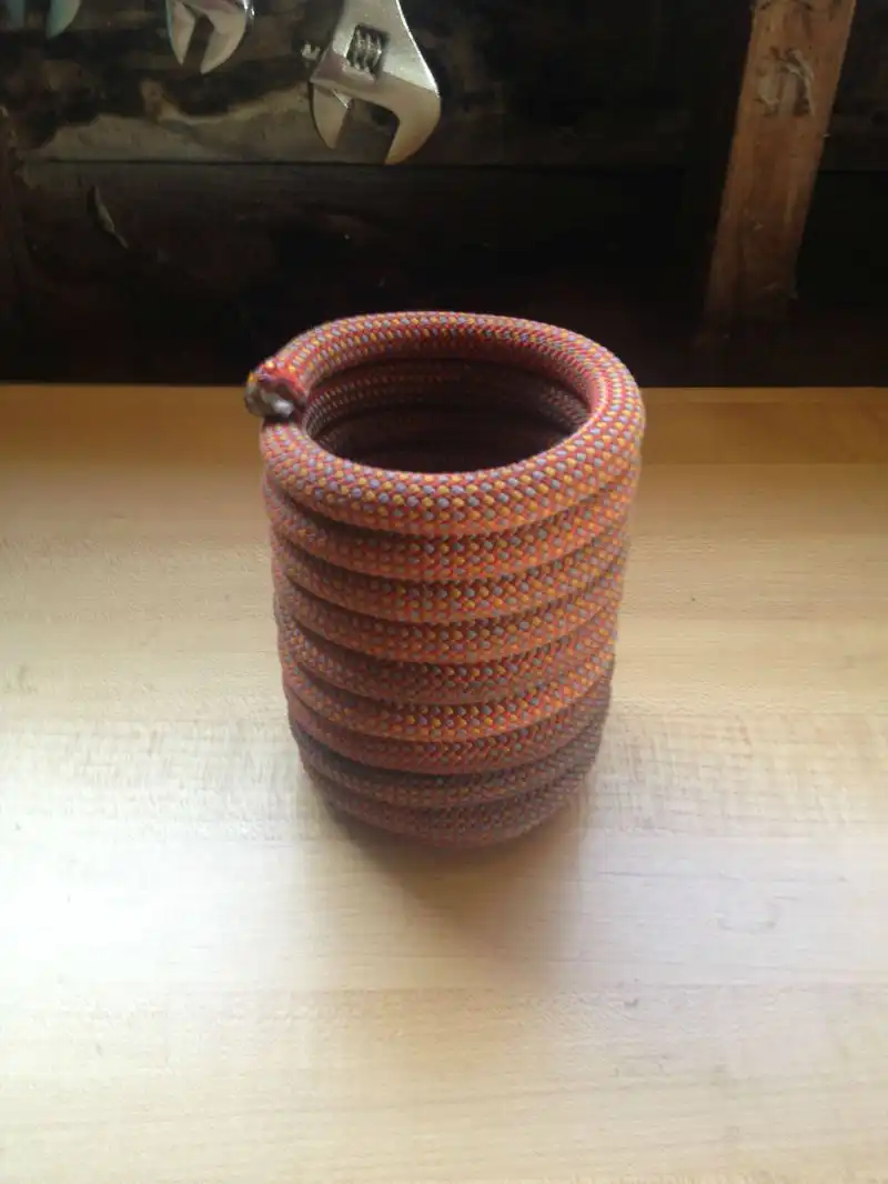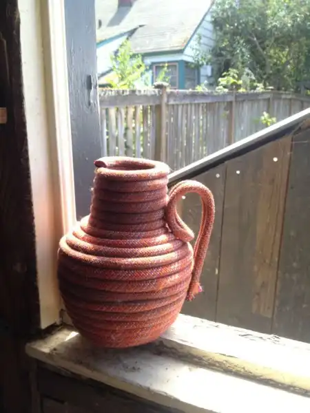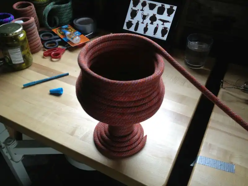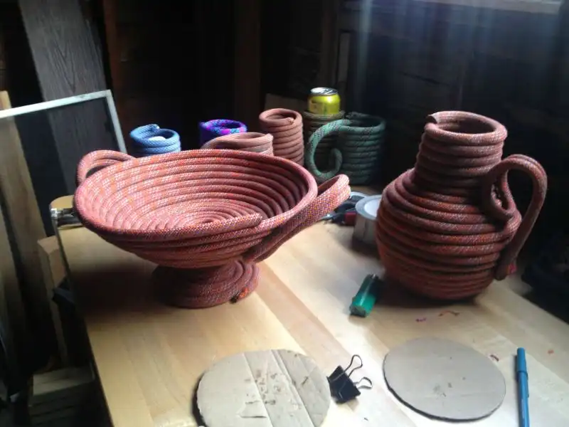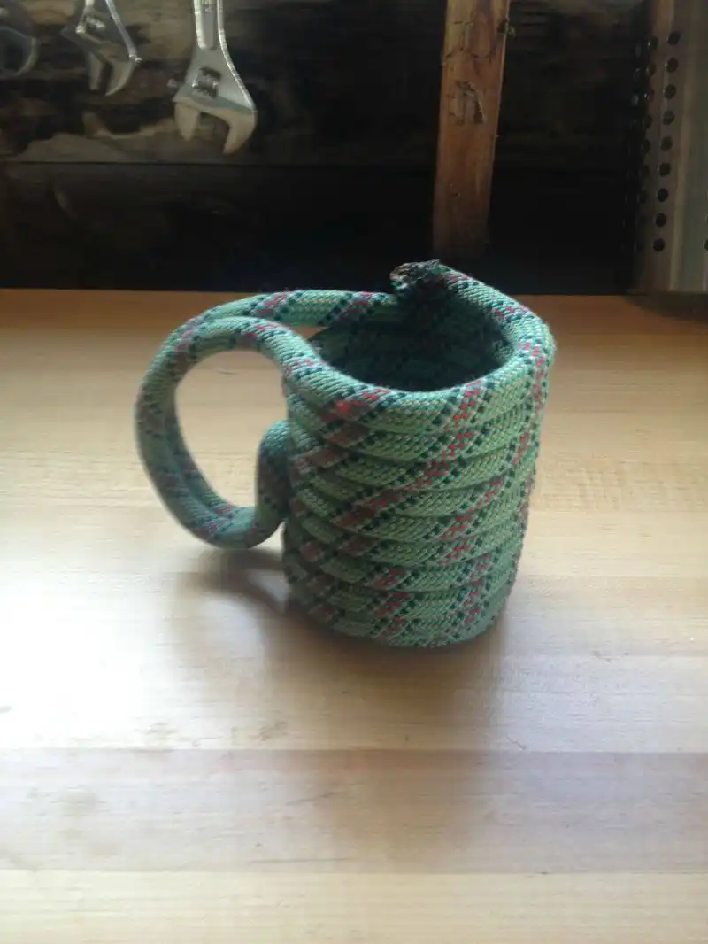 Имеем дело со случаем, когда одно хобби дало жизнь другому. У автора этих фото необычное увлечение - он делает гончарные изделия из отработавших своей альпинистских верёвок. Придавая канату нужную форму и проклеивая соединения, он делает кружки, горшки, кувшины и прочую домашнюю утварь.