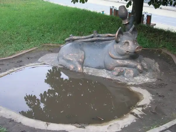 Памятник кошельку представляет собой глиняную скульптуру, созданную не профессионалами, а обычными рабочими завода железобетонных конструкций. Она изображает держащую кошелек руку, у основания которой расположены “тающие” часы в стиле Сальвадора Дали.