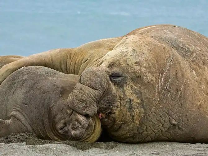 Кажется, что самец целует подругу, но, скорее всего, он ее кусает, чтобы она не ускользнула из его страстных объятий. Вес взрослых самцов достигает четырех тонн, самки могут весить в десять раз меньше.
