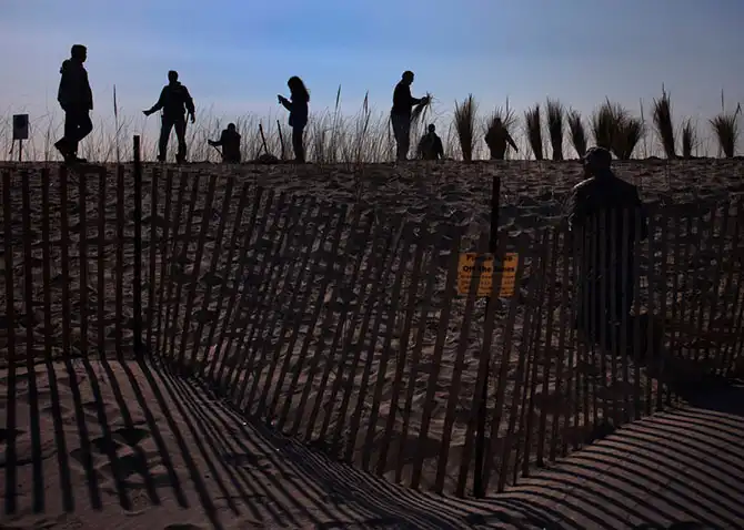 Местные жители и волонтёры сажают траву на песочной насыпи, сооруженной для защиты города Бризи-Пойнт, в первую годовщину урагана «Сэнди» в Нью-Йорке, 29 октября.