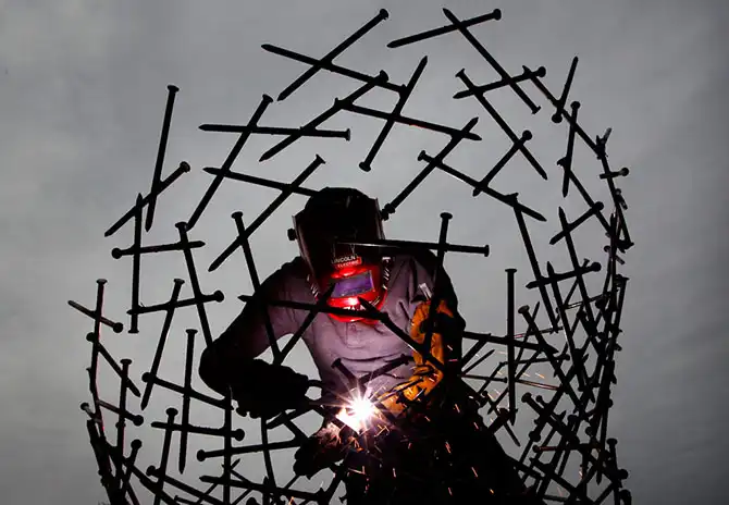 Скульптор из Мемфиса Элиша Голд (Elisha Gold) создаёт огромную голову из гвоздей на 7-м ежегодном фестивале искусств RiverArtsFest в Мемфисе, штат Теннеси, 27 октября.