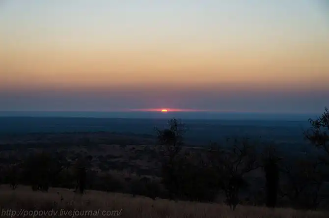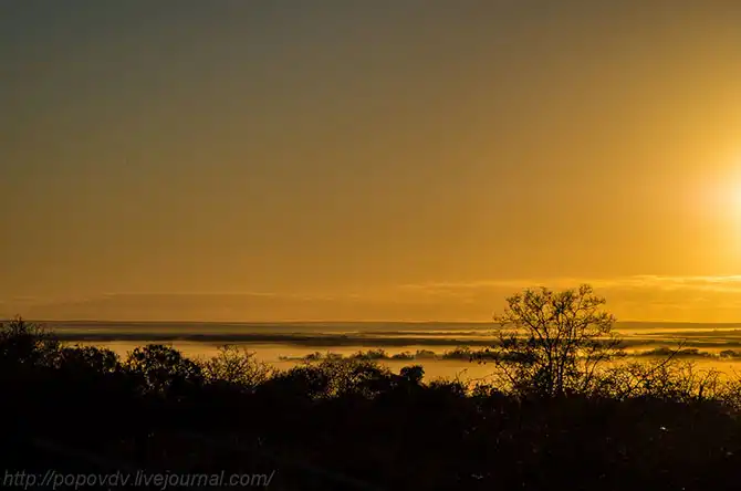 Раннее утро над саванной. В низинах собирается холодный туман.