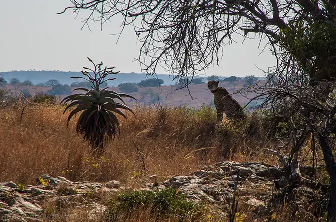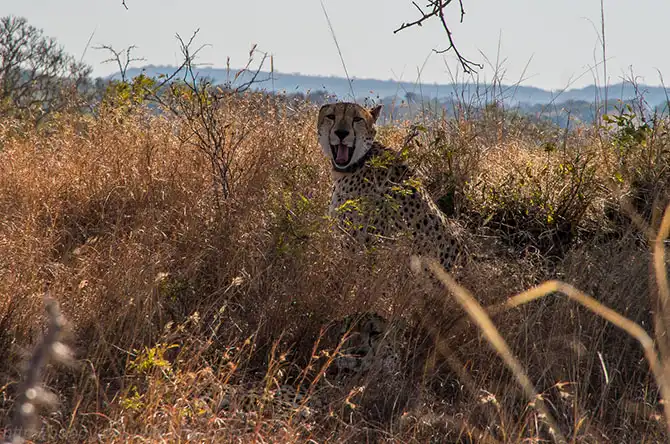 Два брата – Тим и Том. Чтобы сделать этот снимок, нам пришлось два часа трястись по ужасной дороге в самую дальнюю часть заповедника, а потом пешком подойти к ним на расстоянии 20 метров. Гепарды отдыхали в тени под деревом и были настроены миролюбиво.
