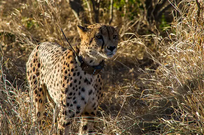 На шее у гепарда новый вид ошейника, придуманный Крисом Келли из Wildlife Act. Шипы защищают животное от удавок и капканов, которые ставят браконьеры на антилоп из ближайших к заповеднику сел. Гепарды или собаки регулярно попадают в эти капканы и часто это заканчивается трагически. Удавка затягиваясь на ошейнике не соскальзывает на шею, а задерживается шипами.