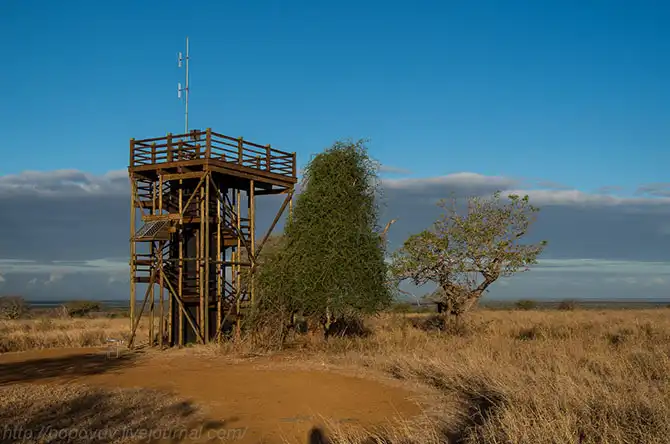 Поскольку в заповеднике преобладают равнина, то чтобы поймать сигналы с ошейников приходилось частенько подниматься на эту наблюдательную вышку.