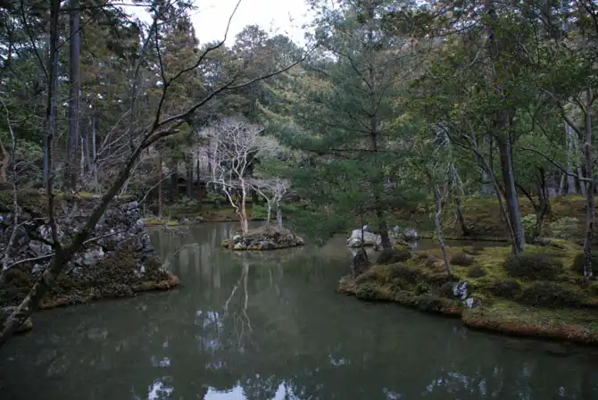 Сегодня в саду Мхов их насчитывается 130 видов. Они покрывают толстым ковром почву, камни, мосты, острова, стволы деревьев. Знаменитый сад находится у восточного основания храма. В центре сада находится пруд, который имеет форму китайского иероглифа «сердце» или «разум» и состоит из трех небольших островов.