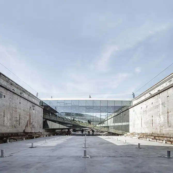 С 1915 года Датский морской музей размещался непосредственно в здании замка, представляя историю датского флота со времён Возрождения до наших дней. Давно запланированный перевод музея в новое здание позволил освободить его помещения и использовать их в будущем для новых экспозиций. Перед архитекторами, однако, стояла непростая задача по перенаправлению туристических потоков в новый корпус, который обязан был стать примечательным. Одновременно с этим необходимо было сохранить старую гавань, не нарушая восприятие привычной панорамы. Для этого новое здание музея было решено поместить в рамки старых стен сухого дока, буквально опустив его на несколько метров под землю. А рассекают эту бездну три двухуровневых моста из стекла и стали, выступающих в виде галерей, организующих свободное перемещение посетителей от одной части музея к другой, а также символизирующих тесную взаимосвязь между старым и новым.