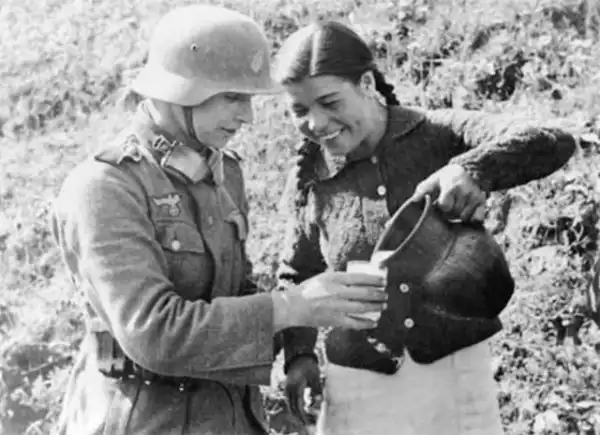 «Украинская девушка наливает молоко немецкому солдату», Октябрь 1941 г.