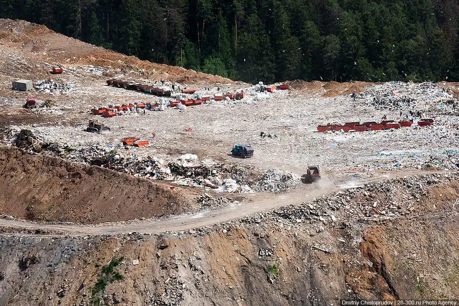 В России мусор свозится на свалки — их всего около 11 000. В них захоронено более 80 миллиардов тонн отходов. Выглядит это так (фотография полигона захоронения твердых бытовых отходов «Левобережный» с вертолета).