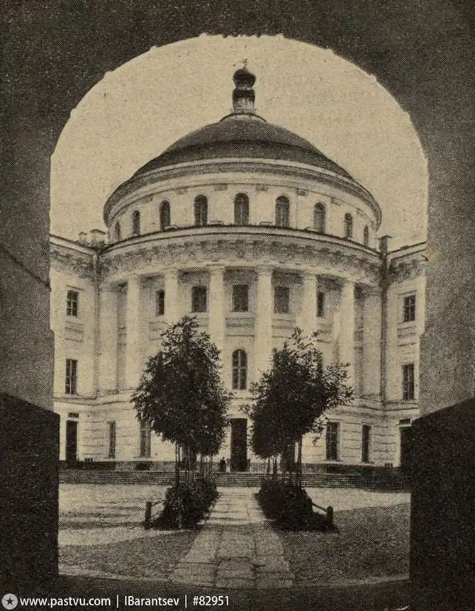 Интересно, что изначально купол венчал Св.Георгий Победоносец, поражающий змия, но во время войны 1812 г. он исчез. Говорят, французы взяли в качестве трофея, а когда в здании разместился Окружной суд, то его увенчали короной с краткой надписью под ней «ЗАКОН». На что москвичи ответили эпиграммой: «В России нет закона, а столб и на столбе корона».