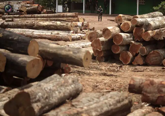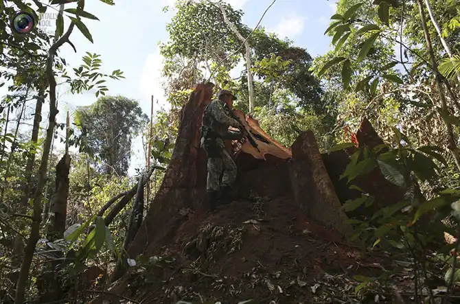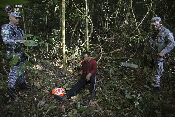 Бойцы из отряда Министерства окружающей среды Бразилии охраняют нелегально спиленные деревья.